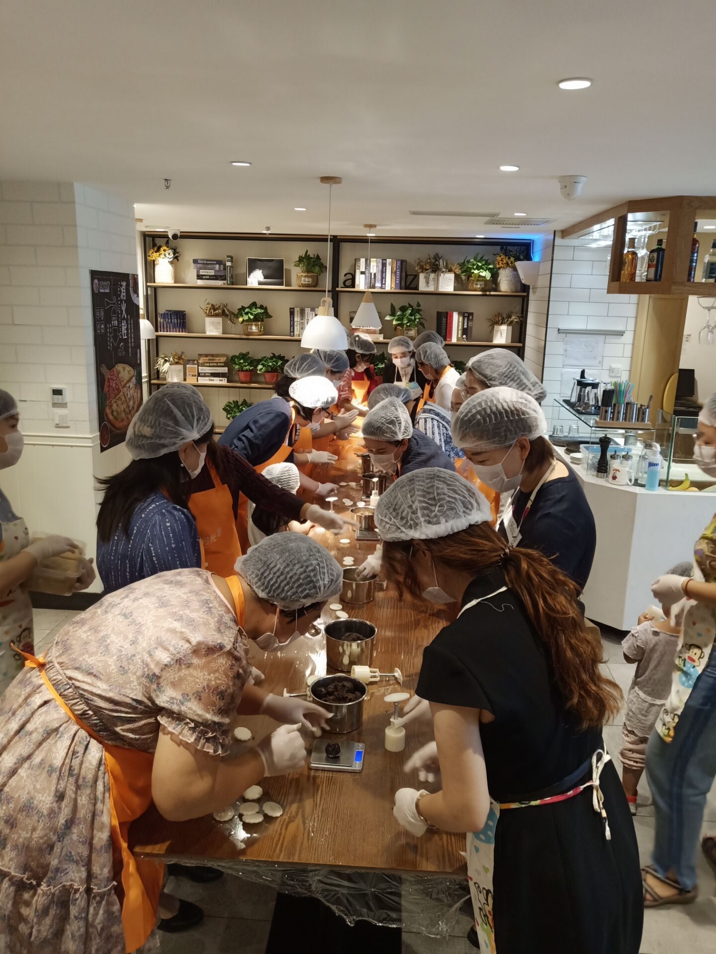 晓阳微熏,店内已是一片欢乐的海洋,热情洋溢的教师们正翘首以待。9点时分,活动正式开始。统一着装的大家有模有样地围拢在长桌四周,俨然成竹在胸的"糕点师",个个雀跃不已。满屋都是月饼馅儿的馨香,阵阵袭来,沁人心扉,在店里人员的指导下,几十个“面点师”同时上阵制作月饼,场面壮观、热烈、温馨,他们一边畅所欲言,一边团结互助,亲如一家。“巧出饼师心,貌得婵娟月”,人人都使出浑身解数,忙得不亦乐乎,饱含着浓浓的团圆情的月饼很快就摆成了“长龙”.......,虽然有的月饼的模样不尽如人意,但却是自己亲手制作,自是让人格外钟爱,每个人的脸上都乐开了花儿。上午11点,活动结束。教师们依然意犹未尽,纷纷拍照留念,笑容灿烂。