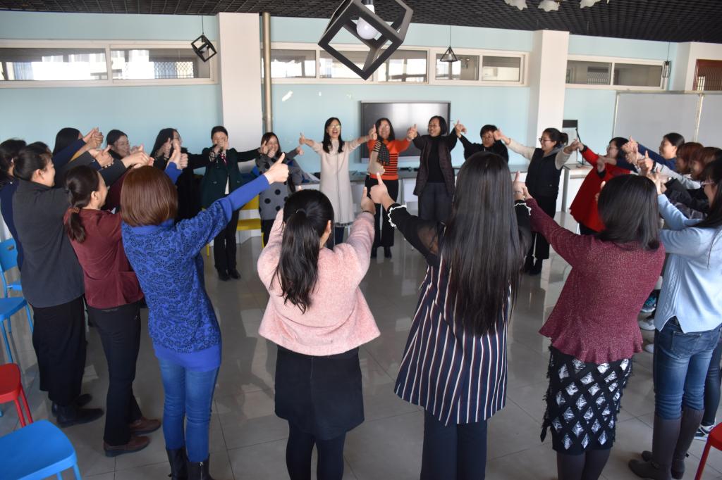 在热身活动阶段,“相似圆”、“松鼠与大树”、“桃花朵朵”等小游戏,让女教职工们不再拘束,开始敞开心扉,融入到团体中。随后,在热烈而有序的气氛中,辅导老师开始带领大家进行本次辅导的主题活动——“我的眼中你最美”。在这个强调欣赏与赞美的游戏中,老师们纷纷打开心扉,互诉心里话,每位老师都谈到这个游戏让自己作为一个崭新的个体,被赞美、被认可,得到了更多的愉悦感与满足感,获得自身的成长。