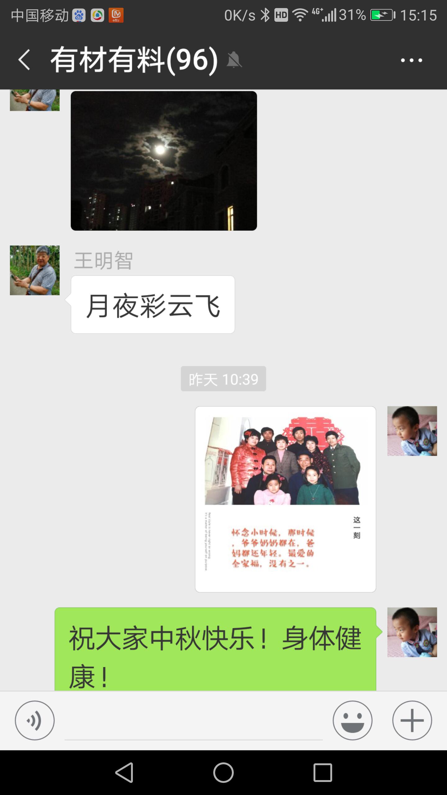 按照校工会统一工作安排,为进一步弘扬中华民族优秀文化,学院工会于9月22-24日组织了“同享网络,温情中秋”中秋节主题庆祝活动,暨在学院微信群“有材有料”中征集老师们的团圆全家福。