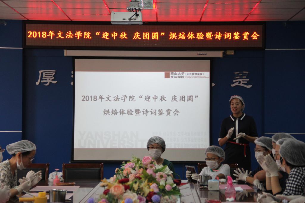 9月20日下午四点,文法学院“迎中秋 庆团圆”烘培体验暨诗词鉴赏会在人文馆224进行。文法学院党委书记刘叶涛、党委副书记杨健民及教师代表参加了此次活动。