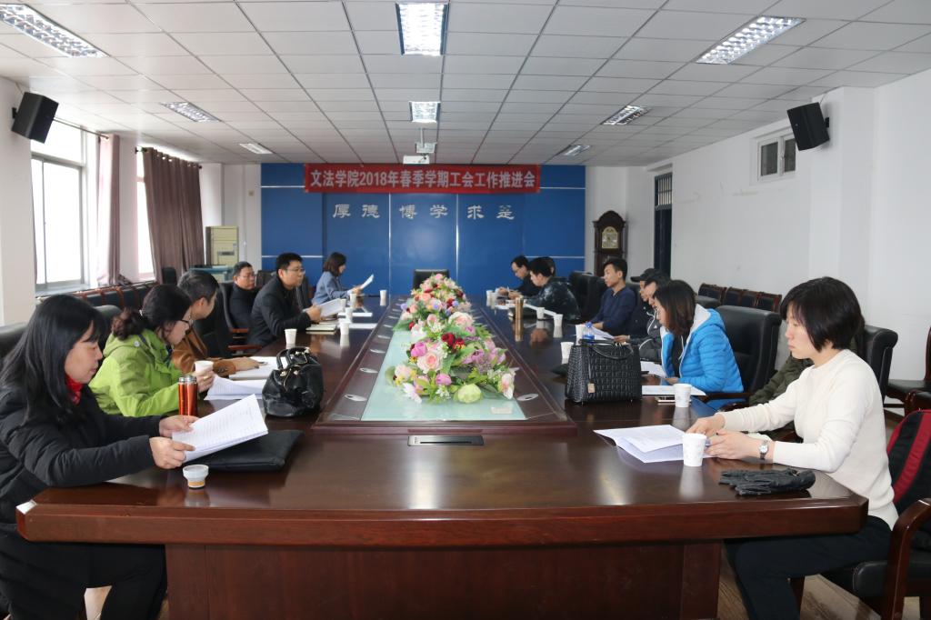 3月14日下午,文法学院召开2018年春季学期工会工作推进会,文法学院党委副书记、工会主席杨健民出席并主持会议,文法学院工会委员、各工会小组组长、兴趣协会会长参会。
