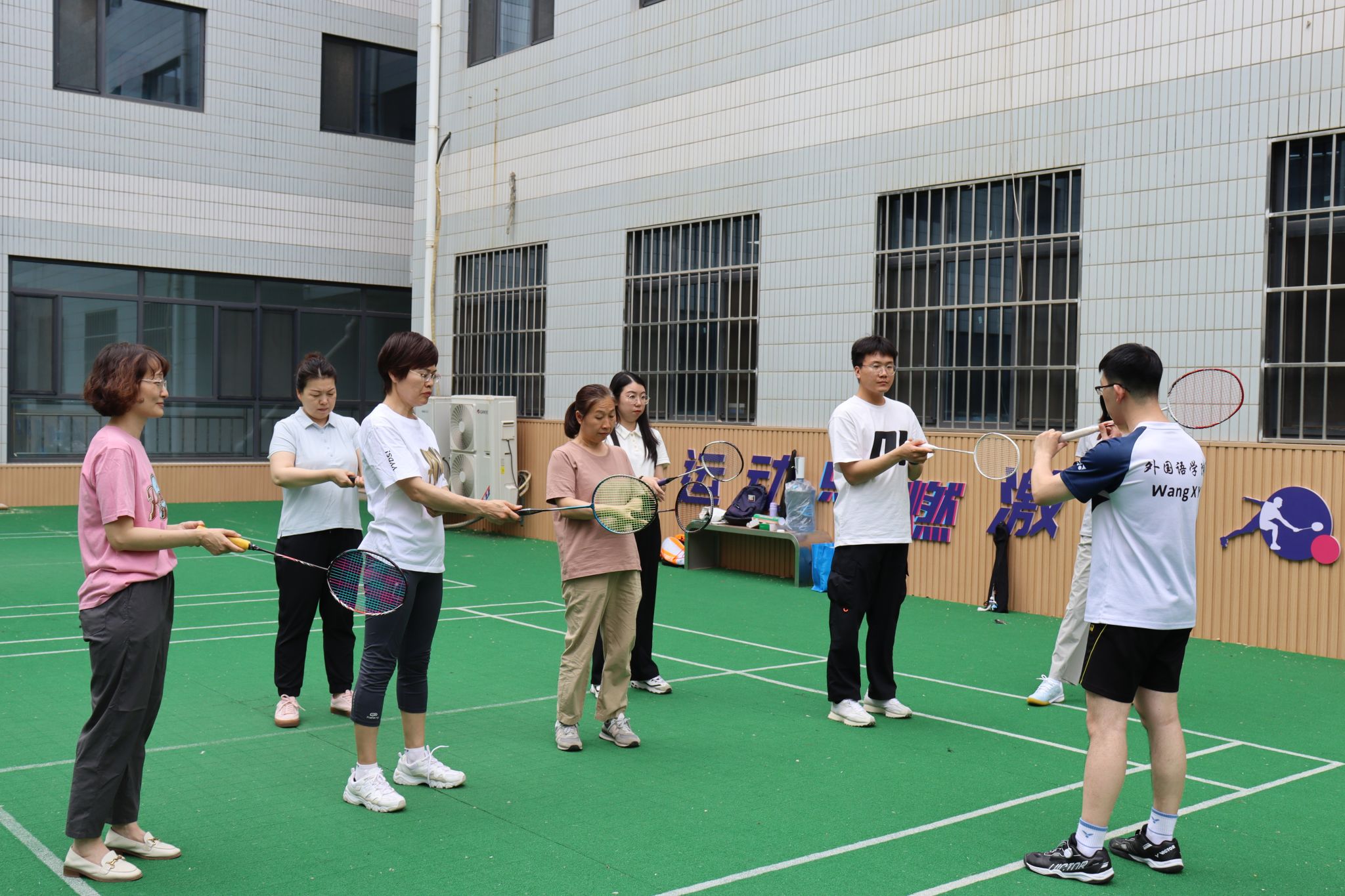 为传播科学健身知识、传授健身技能,提高教职工对羽毛球项目的兴趣爱好,增强体质健康水平,促进体教融合发展,6月5日-6日,外国语学院羽毛球协会在外国语学院悦动广场开展了为期2天的羽毛球项目普及公开课,本次公开课特聘外国语学院学生羽毛球队队长王旭友、马师聪授课,吸引了20余名教职工参加。