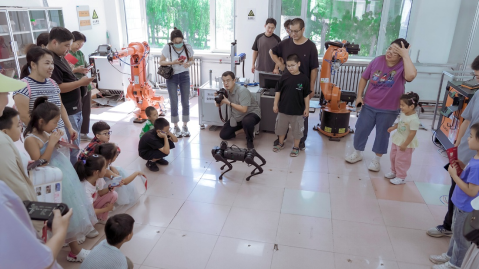 参观者与“机器狗”现场互动(河北省机器人与智能装备科普示范基地)