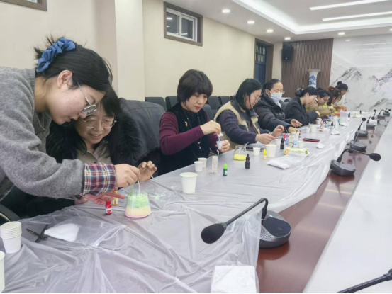 DIY创作环节,女职工们兴致高涨、专注投入,结合自身喜好构思图案、搭配色彩,小心翼翼地铺撒彩沙,亲手打造专属自己的沙画蜡烛。大家相互交流创作思路,现场氛围温馨融洽、秩序井然,处处洋溢着节日的喜悦。