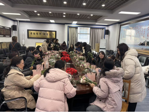 主题演讲结束后,活动移步至机械馆327、301 会议室开展花艺插花特色手工体验。活动现场花香四溢、氛围温馨,女职工们在轻松愉悦的氛围中,认真探索花艺搭配技巧,修剪枝叶、构思造型、点缀装饰,将对生活的热爱与美好期许融入手中的花艺作品。大家相互交流、彼此切磋,在动手实践中感受传统花艺文化的独特魅力,体验手工创作的乐趣。经过一番精心创作,一盆盆错落有致、生机盎然的插花作品新鲜出炉,每一件作品都彰显着大家的巧思与审美。大家手持亲手制作的花艺作品合影留念,欢声笑语中,定格下这份独属于春日的美好与喜悦。