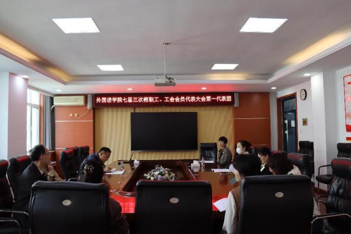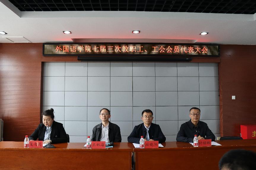 为深入落实教职工民主管理与民主监督权利,广泛凝聚全院智慧力量,4月24日下午2:20,外国语学院七届三次教职工、工会会员代表大会在人文馆416报告厅召开。学院党政领导班子、教职工代表汇聚一堂,共谋学院高质量发展。会议由外国语学院党委副书记、工会主席夏亮亮主持。